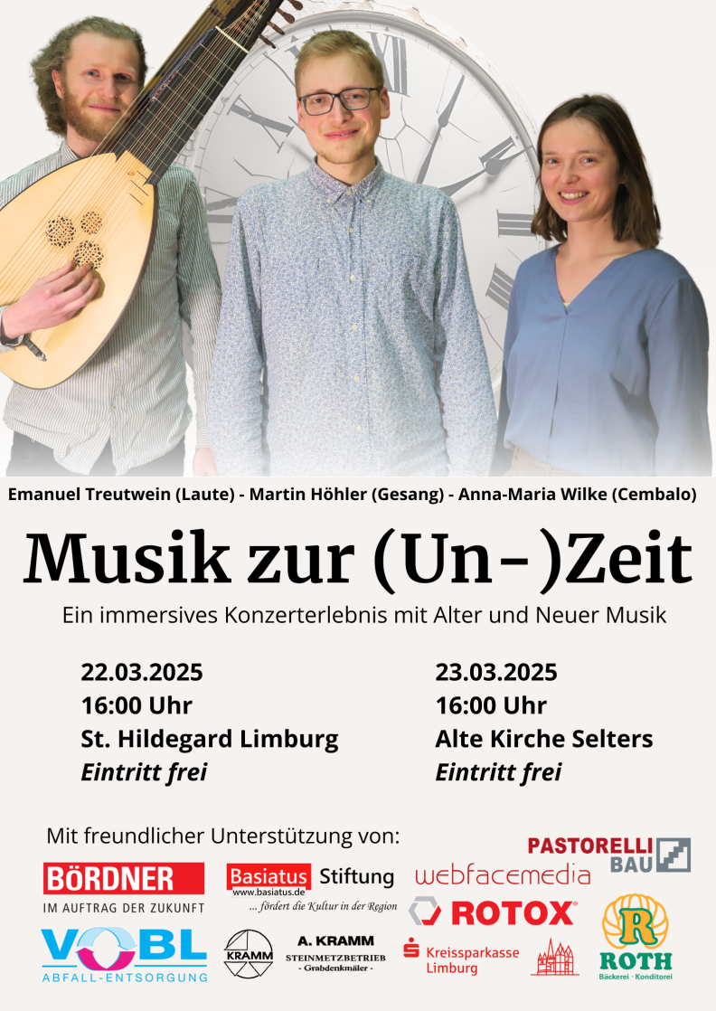 Eine Stimme, ein Cembalo, eine Laute – eine Besetzung, die aus der Zeit gefallen ist. Oder ist sie nicht eigentlich zeitlos? Dieses Konzert soll dem Zeitlosen oder Unzeitlichen in der Zeitkunst Musik nachgehen. Dazu werden in dieser besonderen Dreierbesetzung zeitlose und konkret zeitbezogene Themen in Liedern und Stücken Alter Musik und Neuer Musik behandelt.
